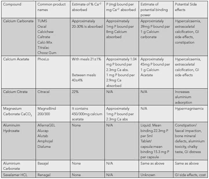 | Divided by estimated binding power or the binder of choice | Remaining P/binding power | 257/39 (approx. P bound by 1g CaCO3) = 6.5 g CaCo3 257/45 (approx. P bound by 1g calcium acetate)= 5.7 g 257/15-30 (approx. P bound by 1 Al(OH), tablet= 12-17 tablets 257/64 (approx. P bound or 800mg sevelamer HCI) = 4 tablets 257/32 (approx. P bound per 400mg sevelamer HCL) = 8 tablets Note: Calculations for OD would use 285 instead of 257 |