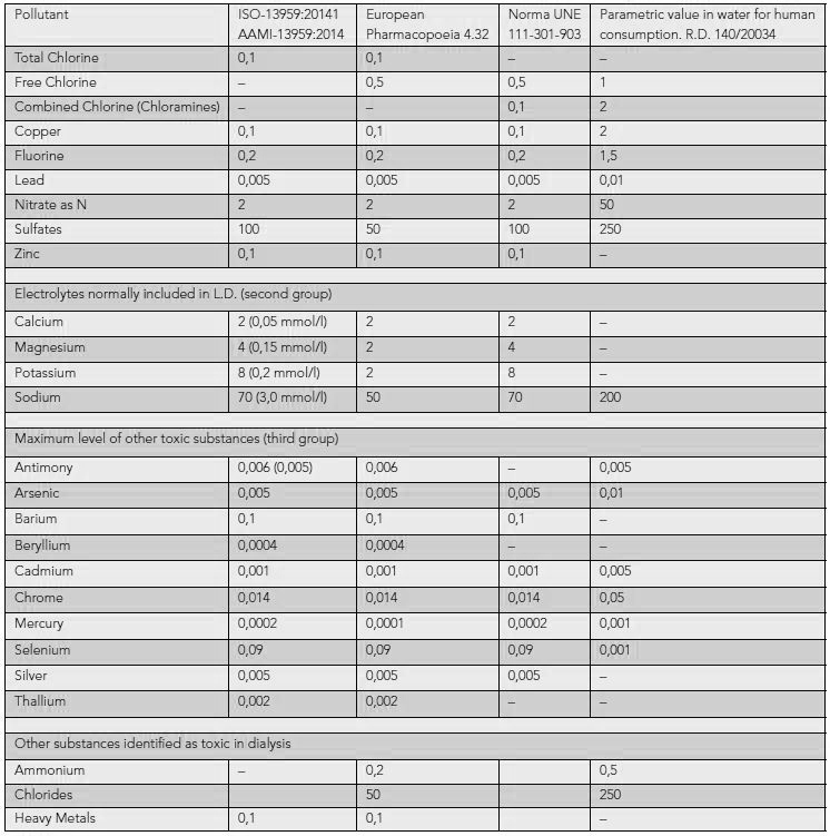 A patient who is on dialysis three times a week for four hours, has direct blood contact with 360 liters of water. With regard to water consumption, it should be also considered that a water treatment may run continuously even when dialysis machines are idle and production capacity is commonly oversized to ensure higher flows during disinfection of dialysis machines. If this water is not treated and purified morbidity and mortality would be high. Unfortunately water treatment spends a lot of energy to transform drinking water into water meeting international standards for dialysis. There are several general recommendations on how water treatment should reach the quality of ultrapure water once it has been treated: a double stage of osmosis, or a stage with a second element composed of one or a combination of the following: A) UV lamp plus ultrafilter; B) ultrafilter; C) electrode ionizer4. European norms describe how to build, certify and maintain the performance of a water treatment for HD as well as the quality required for HD fluids in “Guidance for the preparation and quality management of fluids for haemodialysis and related therapies”, ISO 23500:2014 and in “Quality of dialysis fluid for haemodialysis and related therapies”, ISO 11663:2014.