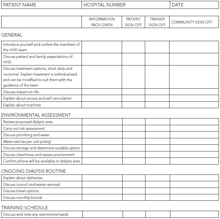 To maintain structure it is important to use a checklist for any home visit. A sample checklist for a pre-home dialysis visit is provided in Appendix 1. The home visit should be tailored to each patients’ requirements, looking at their physical, social and psychological wellbeing.