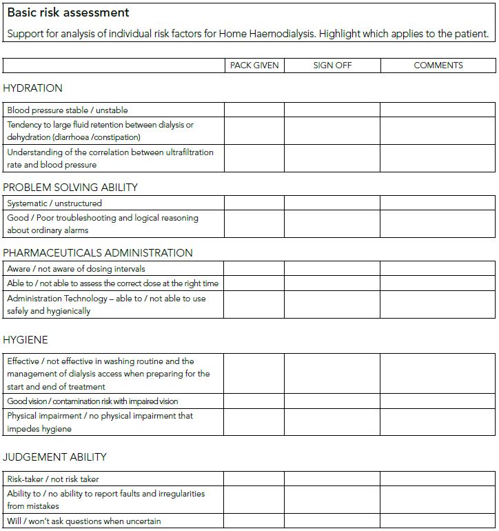 Patients using HHD have gone through extensive training and many units ask them to sign a liability form and/or provide certification of competency with HHD. To ensure that the patient maintains their skills and does not take unnecessary risks, an evaluation of their risk should be performed regularly. Below is a suggestion of how that form could be designed.
