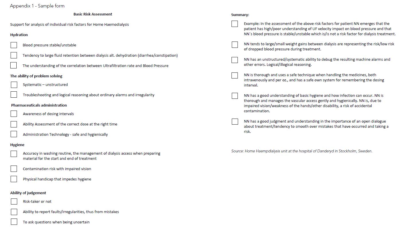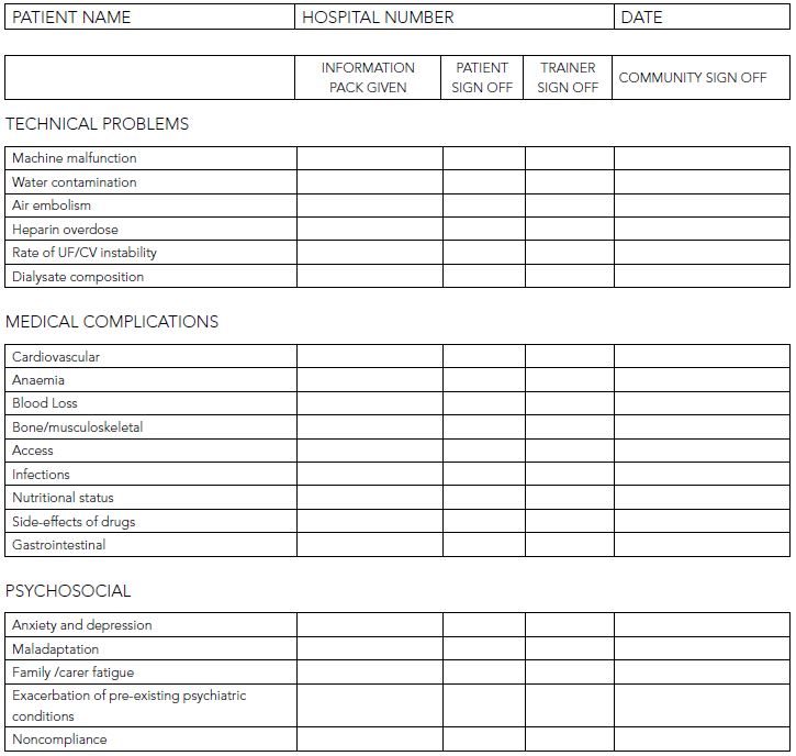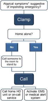 When or if an incident occurs, it is most important that the patient has been trained how to manage this circumstance. One example is a major issue that means dialysis cannot safely continue. The patient is taught to discontinue dialysis and can be provided with a visual reminder “algorithm“. All patients can be given a preventive emergency kit with the algorithm and emergency equipment for disconnection directly positioned near their HHD machine.