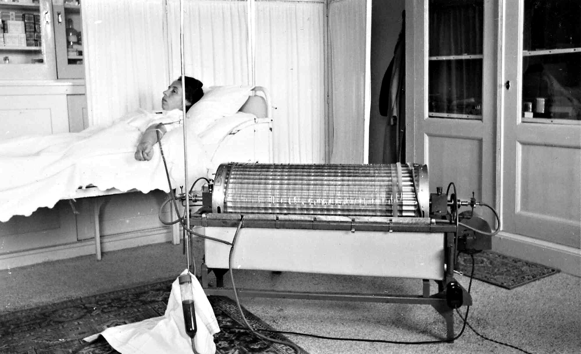 In 1945, after WWII, Kolff’s technique was used more widely, particularly in Sweden and the USA. Kolff was invited to take his artificial kidney to New York and the first successful dialysis in Mount Sinai Hospital was in January 1948. Eight hours after the first dialysis using the Kolff machine, the patient passed urine. The treatment had been a success. Further reading on Kolff can be found here. In later years, the rotating drum was modified to become easier to use. For example, the drum was made of stainless steel and a tensioning device was used on the cellophane membrane as it had a tendency to stretch during use. These improvements paved the way for wider acceptance and use of dialysis treatment6.