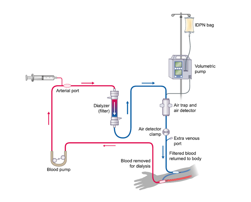 IDPN is administered via an infusion pump that can overcome venous pressure in the dialysis blood lines. This fluid is then mixed with the patient’s venous blood and returned to the body through the venous access. During IDPN, up to 1lt of parenteral nutrition can be administered at a maximum rate of 250 ml/h, to be able to infuse 1lt in 4 hours.(Carrero et al., 2023)